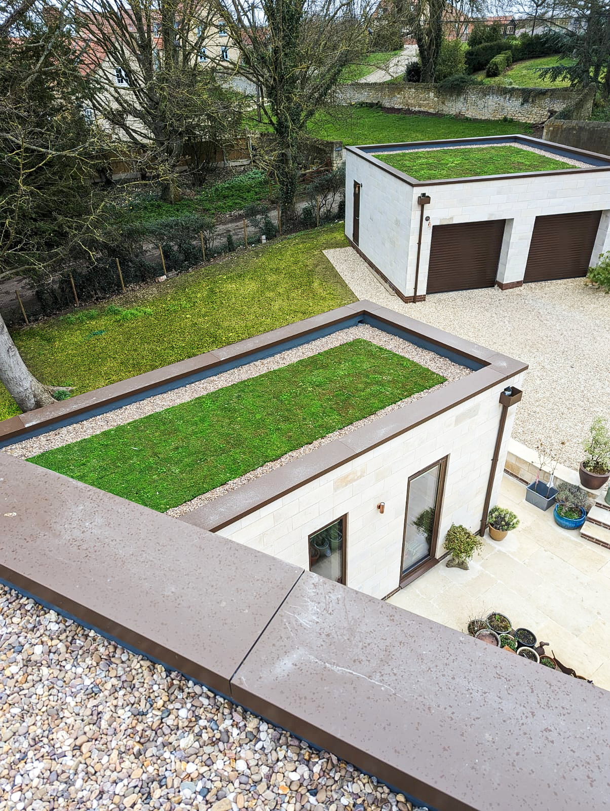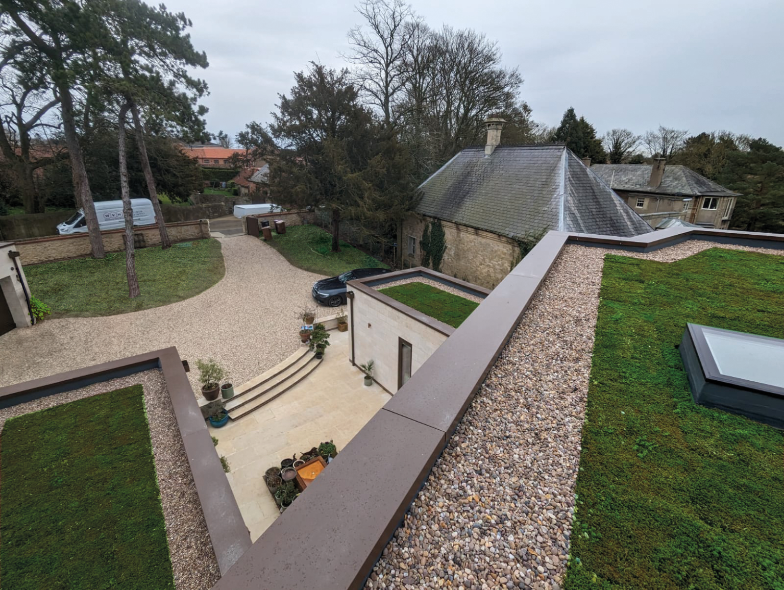 This new-build house is situated in the quiet village of Boothby Graffoe, Lincolnshire. The work shown in these photos was completed April 2023 by C & C Fibreglass of Lincoln, and covers approximately 150m² over five separate areas, finished with a modular ‘cassette’ sedum green roof.