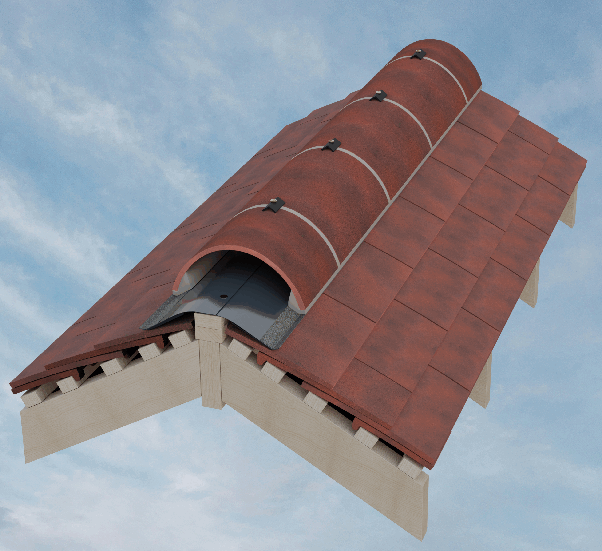 A universal ventilating GRP ridge tray system to provide high level roof ventilation in applications where a traditional mortar bedded ridge tile appearance is required.